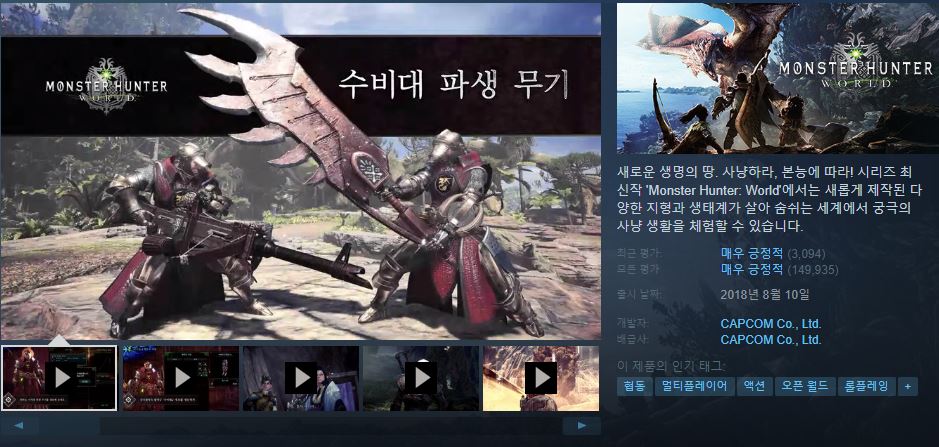 새로운 생명의 땅. 사냥하라, 본능에 따라! 시리즈 최신작 'Monster Hunter: World'에서는 지형과 환경생물, 몬스터의 생태계까지도 이용할 수 있으며, 갖가지 방법을 이용해 거대한 몬스터에게 도전합니다. 새롭게 제작된 'Monster Hunter'의 세계에서 여러분이 원하는 궁극의 헌터 라이프를 체험해 보십시오.