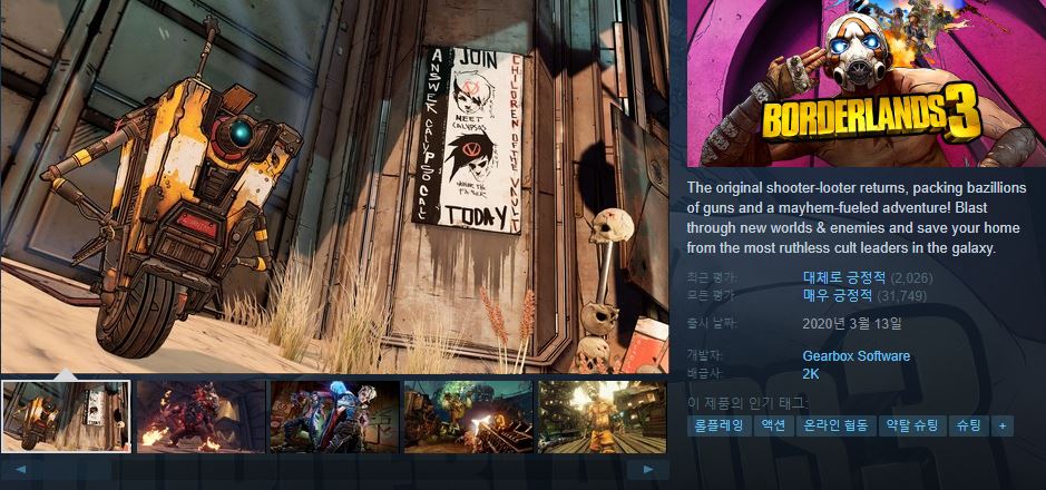 무진장 많은 총기와 정신없는 모험으로 가득한 오리지널 슈팅 파밍 게임이 돌아왔습니다! 4인의 신규 볼트 헌터 중 하나가 되어 새로운 지역을 탐험하며 적을 쓰러뜨려 보세요. 혼자서 또는 친구와 함께 미쳐 날뛰는 적들을 상대하며 아이템을 파밍하고 전 우주에서 자비심 없기로 둘째가라면 서러운 사이비 교주로부터 고향을 지켜야 합니다.