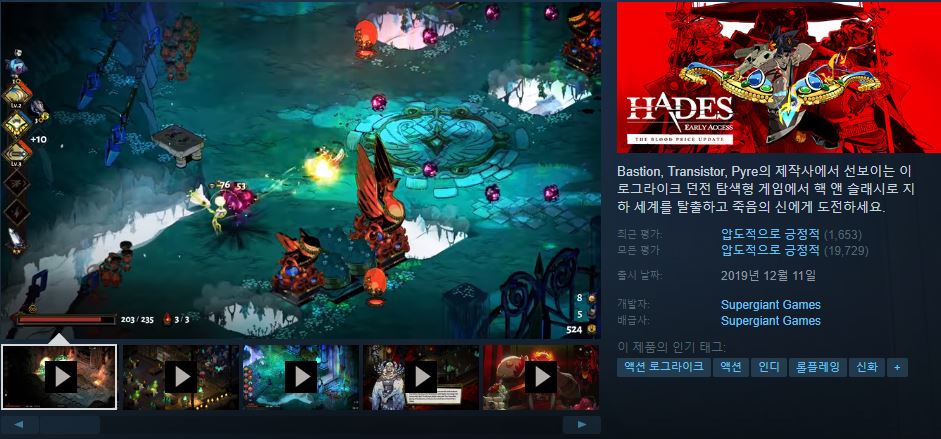 Hades는 Supergiant의 호평을 받았던 전작들에서 장점만 가져온 로그라이크 던전 탐색형 게임입니다. Bastion의 빠른 액션과 Transistor의 풍부한 분위기 및 깊이, Pyre의 캐릭터 중심 스토리텔링이 한 작품에 담겼습니다.